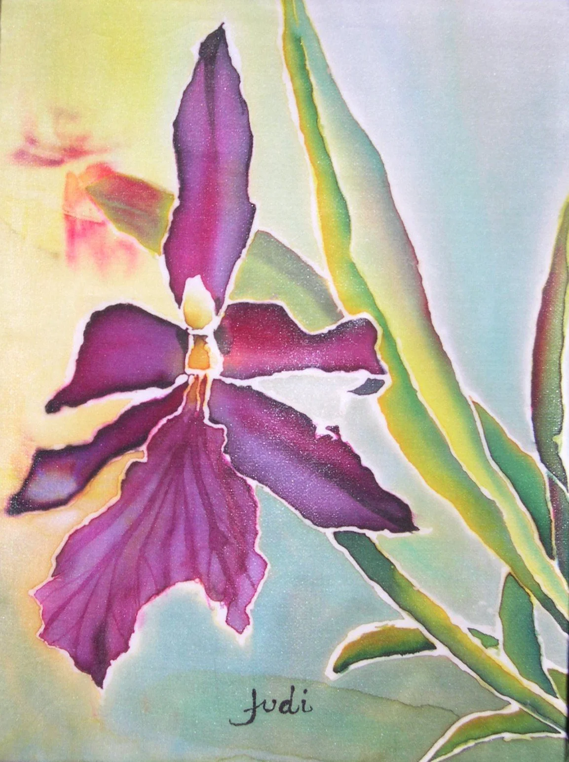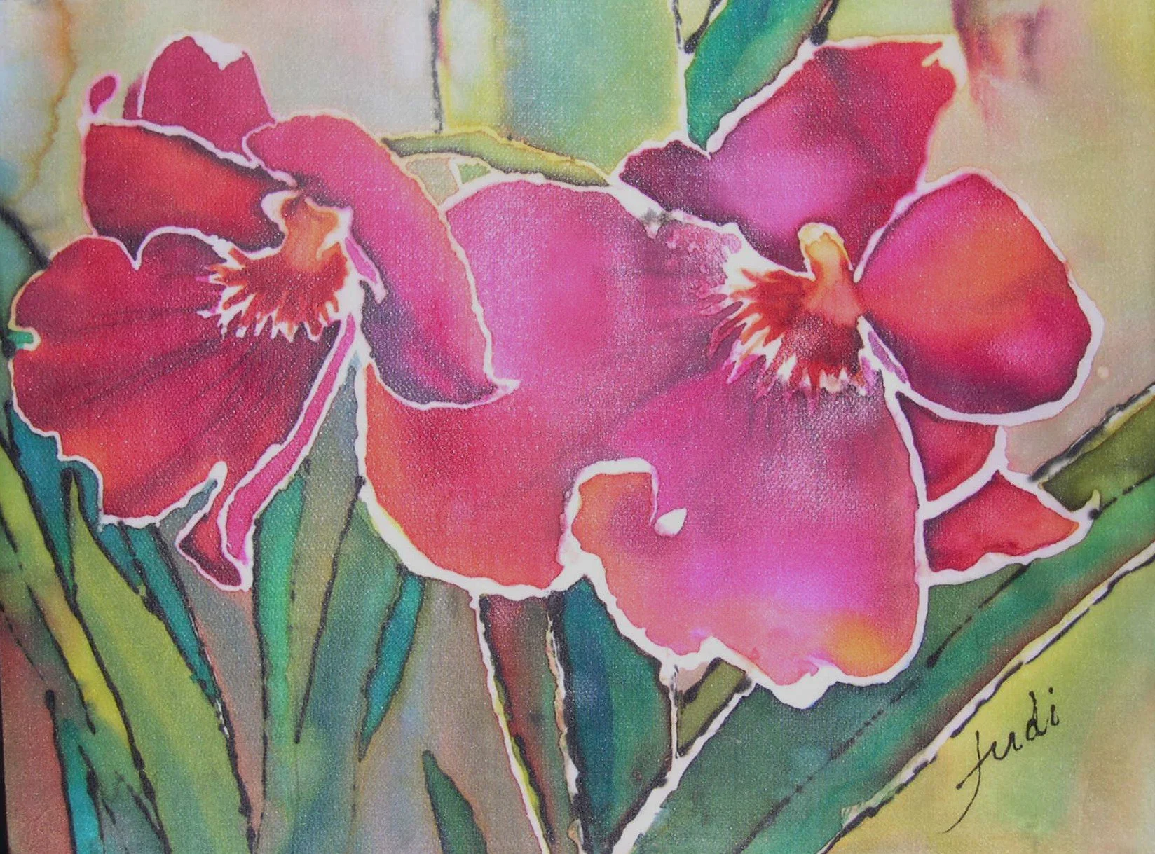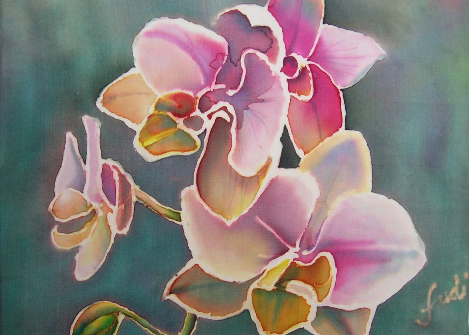Orchids intrigue me. The varieties are endless! Painting them on silk is not as easy as on watercolor paper. Because I do not want them to have a paint by numbers look, it takes a bit of courage to add the dye and wait for the results when it is dry and then finally to steam the piece to set the dye.
