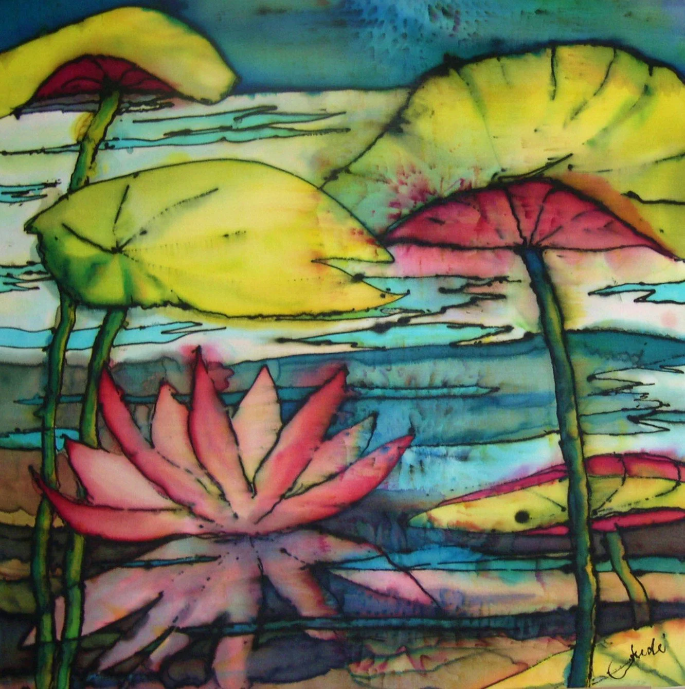 I paint silk scarves without resist and have a lot of fun allowing my choice of 2-3 dyes to mingle, in stripes, swirls, or however I’m in the mood for. Many scarves and other articles can be purchased ready made and there are different dyes too. I use Jacquard Liquid Dyes, which have to be steamed for permanence. Oh! I have also painted with oils, and more recently, Alcohol Inks!