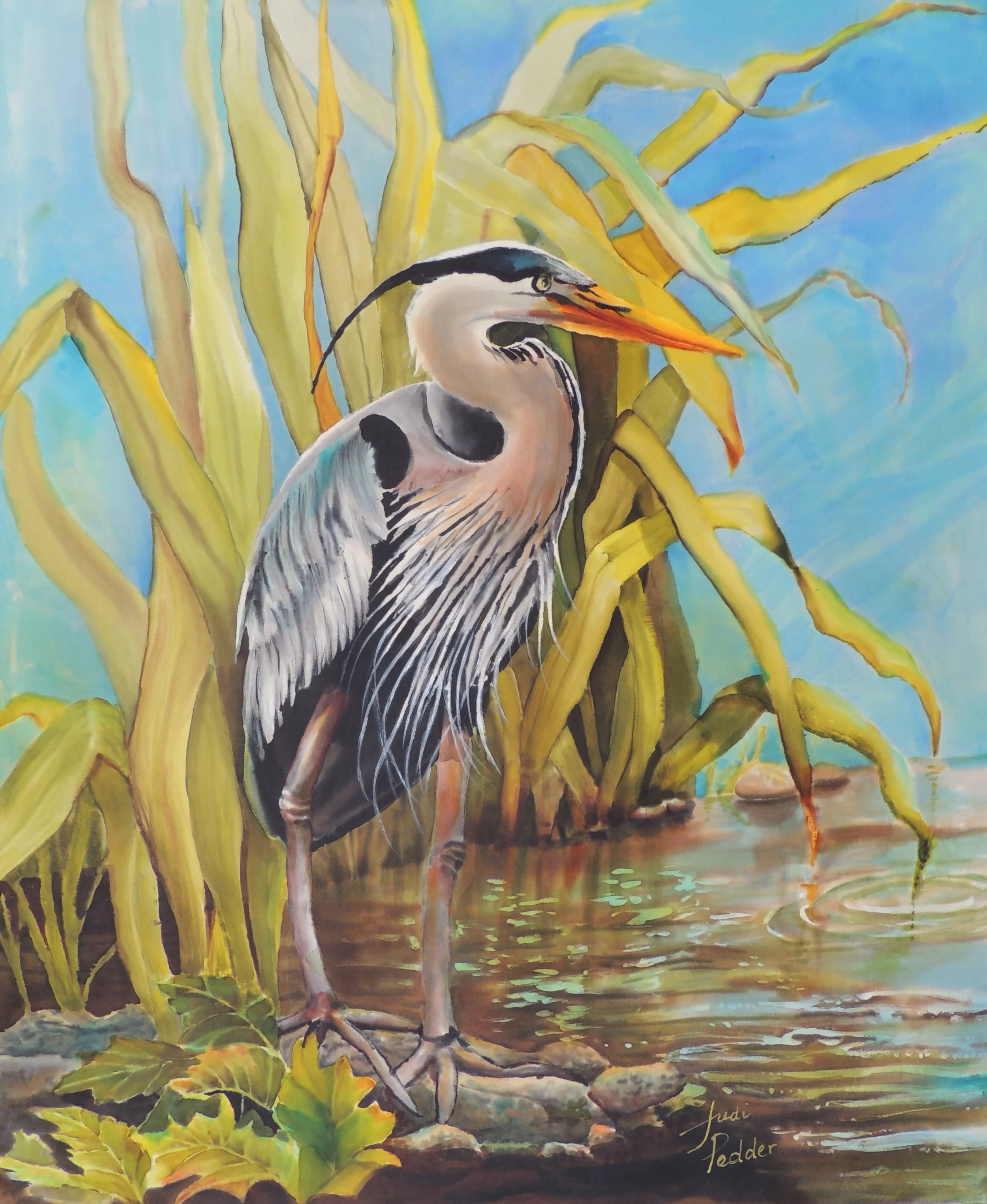 For several years, a local art show in Comox Valley area has promoted the estuary so I decided to paint a great blue heron which frequents our waterways. I chose dye on silk as my medium of choice. This piece is currently adorning the walls of my youngest daughter’s home in Calgary, Alberta.