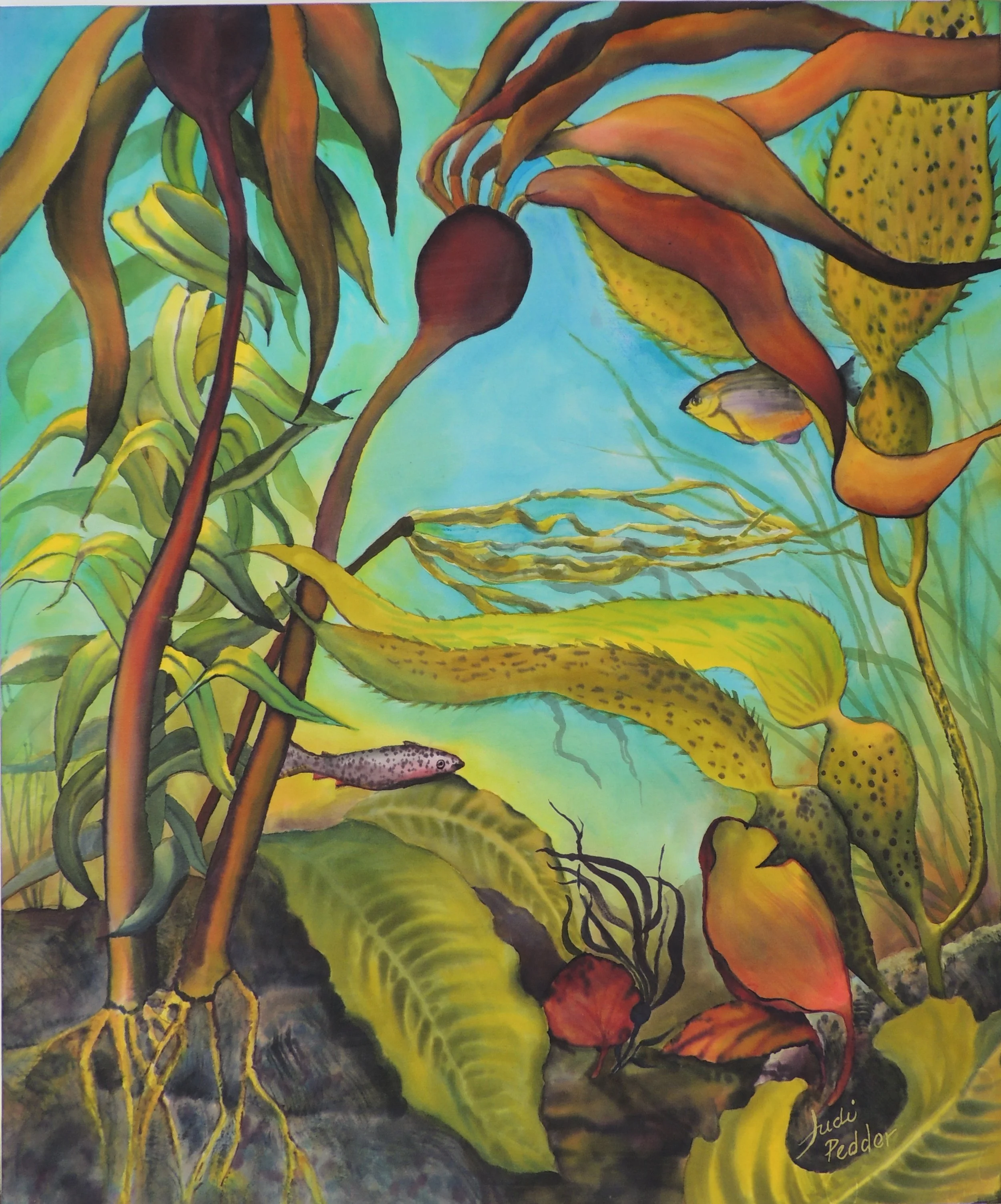To participate in the 2015 “Keeping It Living” Art Show promoting the local estuary in Comox, BC, I chose an underwater scene rather. The tides come and go twice in every twenty-four hours and the estuary is where the salt water mixes with rain run-off. Tides are low governed by the moon. What a truly amazing world we live in!