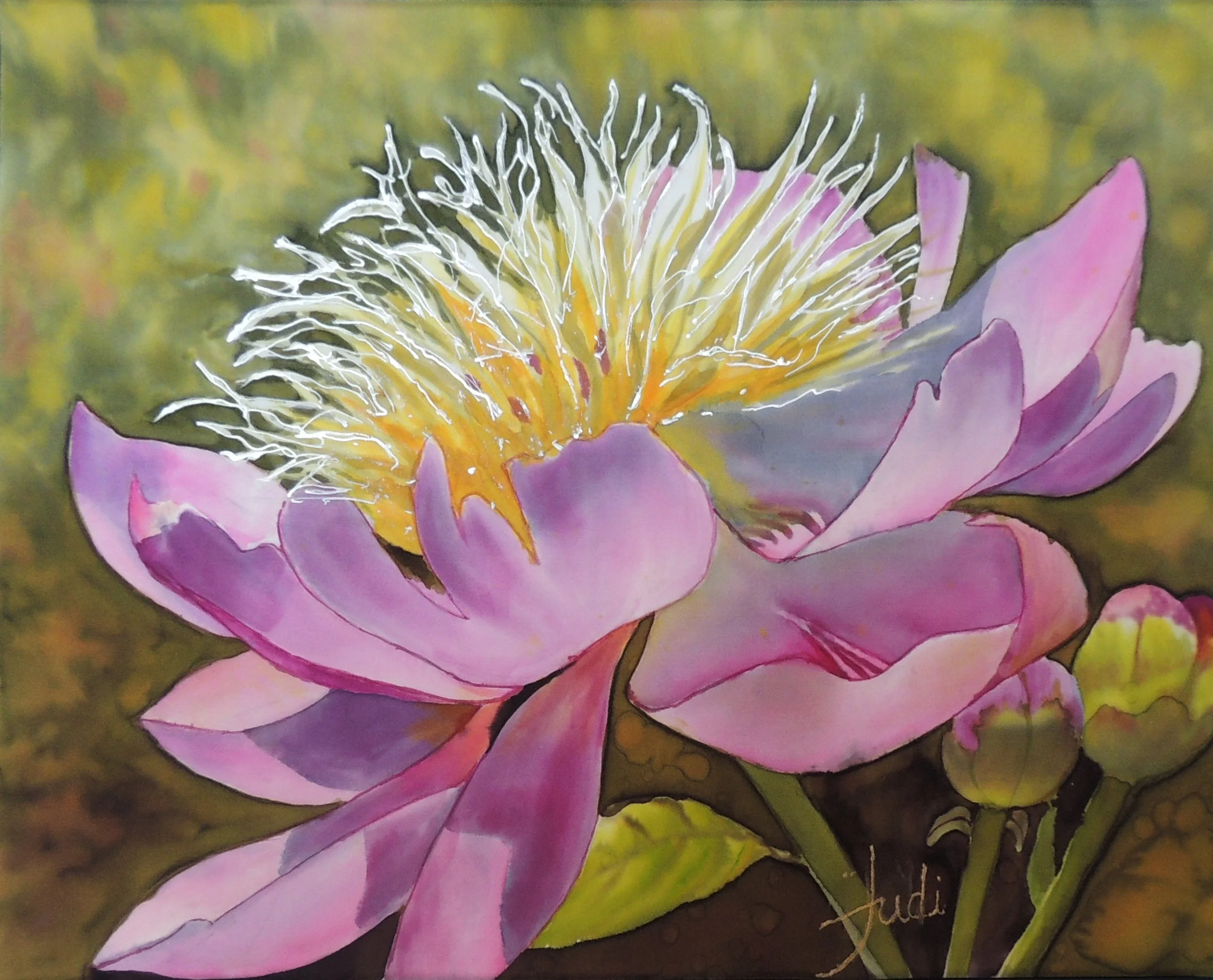 This peony grew in my own garden in Waterloo, Ontario and this is not the first time I have painted it, just the first time with dye on silk. This medium has increased the light and glow from the previous versions - hence my choice for the title.