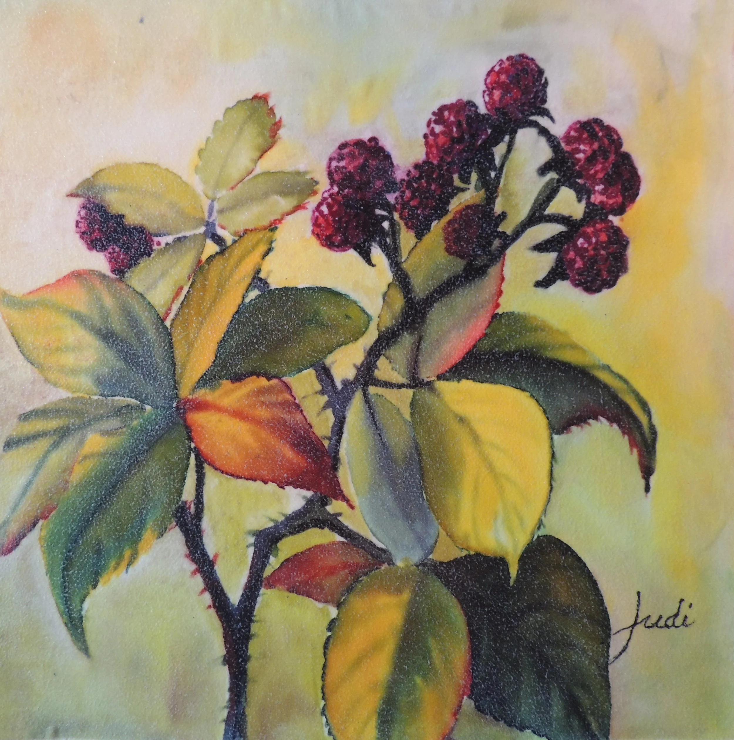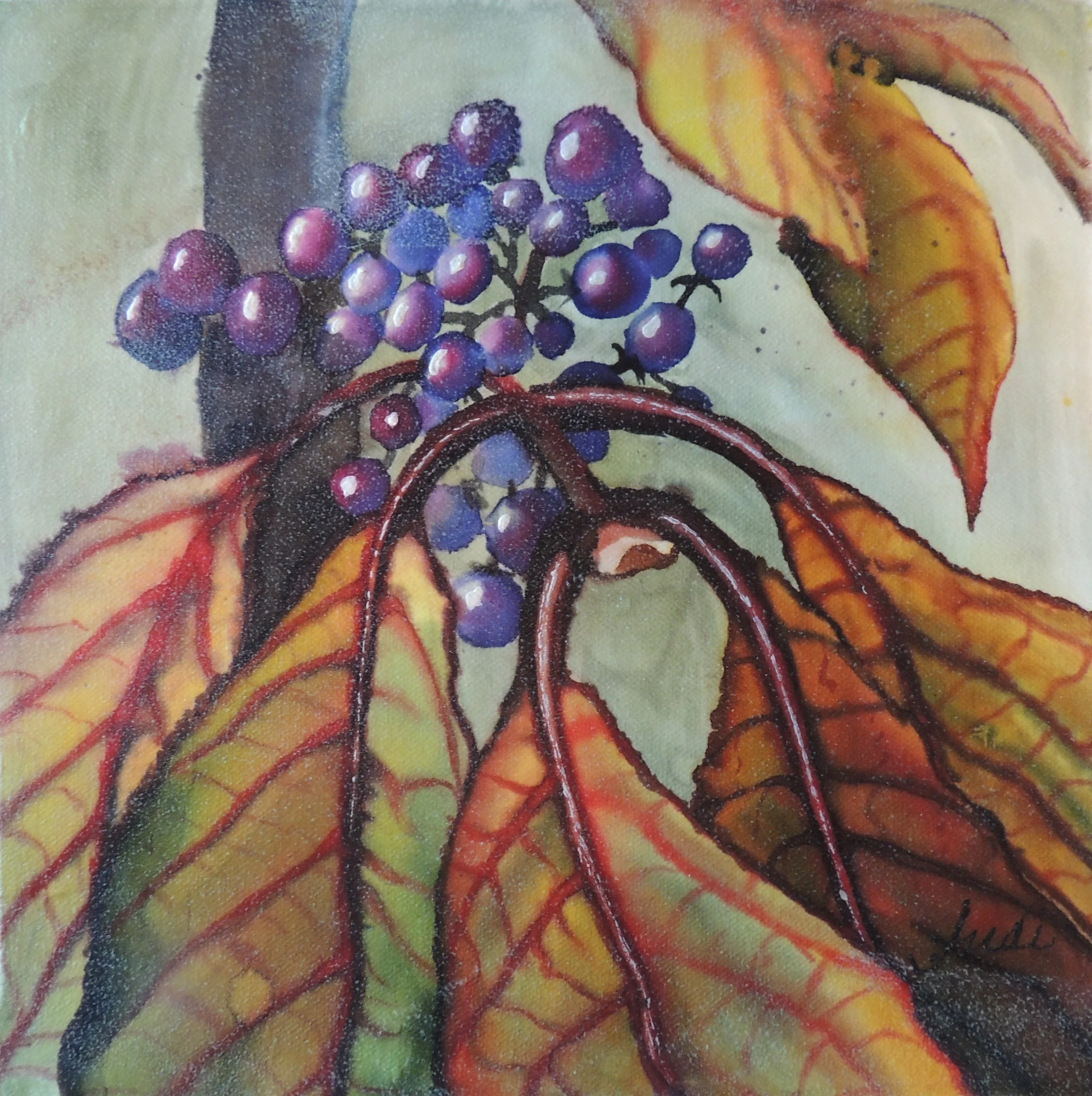 This small tree grew outside of my studio in Comox, BC. In the springtime, the grey-green leaves shelter tiny, hardly noticeable daisy-like flowers. As summer turns to fall, the leaves show up more, dressed in lovely shades of gold and peach with deep purple veins. Suddenly, the berries become purple and stay all winter long shown off against their neutral background, ready to feed the chickadees.