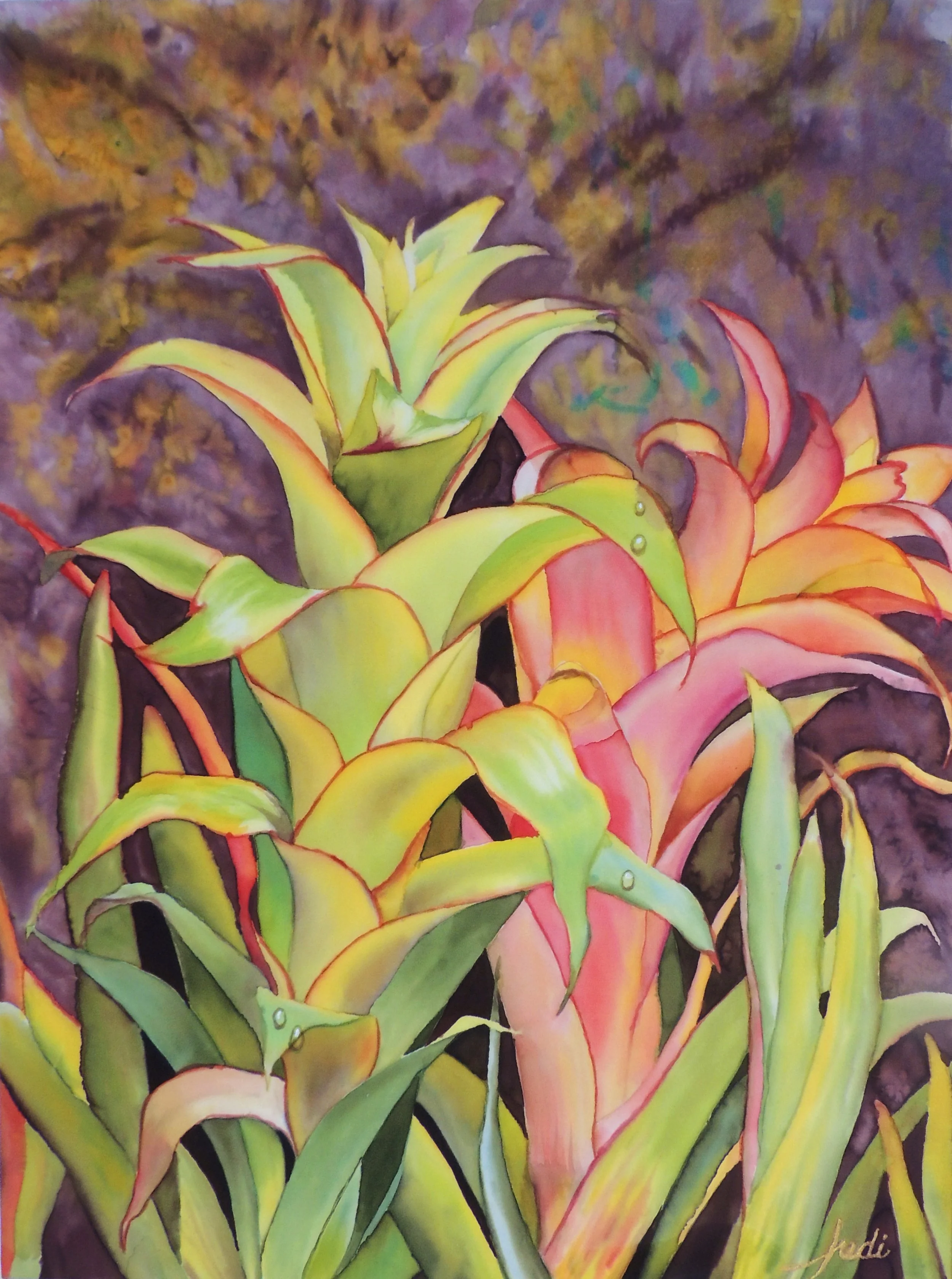 I found these two tropical plants amongst the jungle in The Butterfly Gardens in Victoria, BC. They were a long way apart and my immediate thought was could I combine them? I loved painting this one.! In fact I couldn’t get my chores finished fast enough to get back to it. I was actually sad to finish it. Having said that, as an artist, knowing when to stop is important.