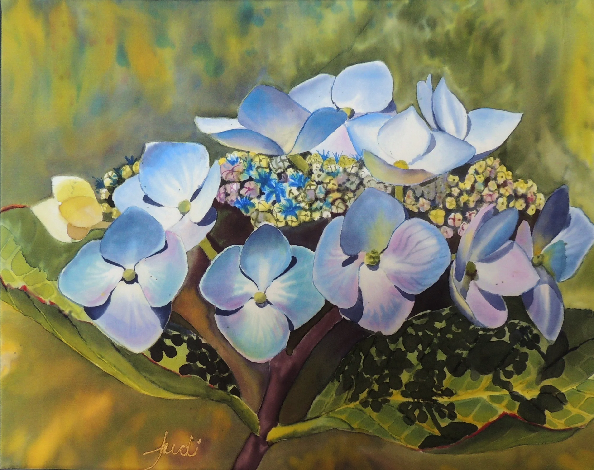 My rendering of the lace cap hydrangea with watercolor on masa paper gained rave reviews. That painting is currently on the website of The Botanical Artist of Canada and was quickly sold. Here is a brand new version on this medium, dye on silk.