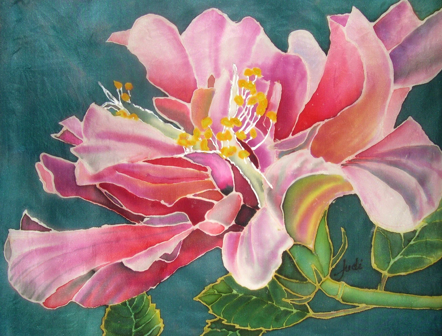 My flower portrait “Rhythm in Pink” of this hibiscus sold quickly to a lovely client from Collingwood, Ontario. I loved the shapes and rhythm of its petals, so I decided to paint it again, this time with dye on silk. Both versions have appeal so the experiment worked.