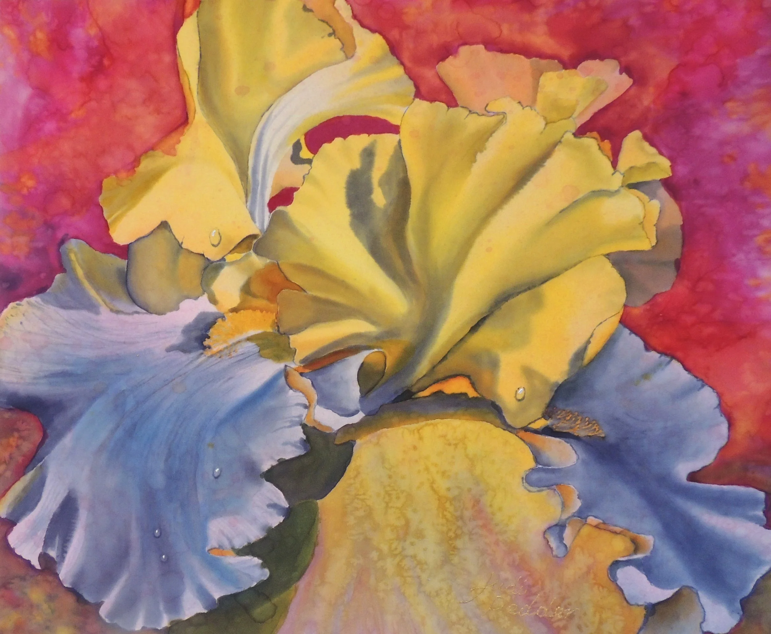 Irises are one of my favorite flowers. I found this one in the garden of the bed and breakfast where we chose to stay on visits to Victoria, BC. Having completed the blossom, my intuition told me to “paint a bright red background!” I printed a photo of the painting, then added a red color with watercolor paint. Only then did I take the risk, added the background, a little spray of diluted pink dye and voila, the title stuck.