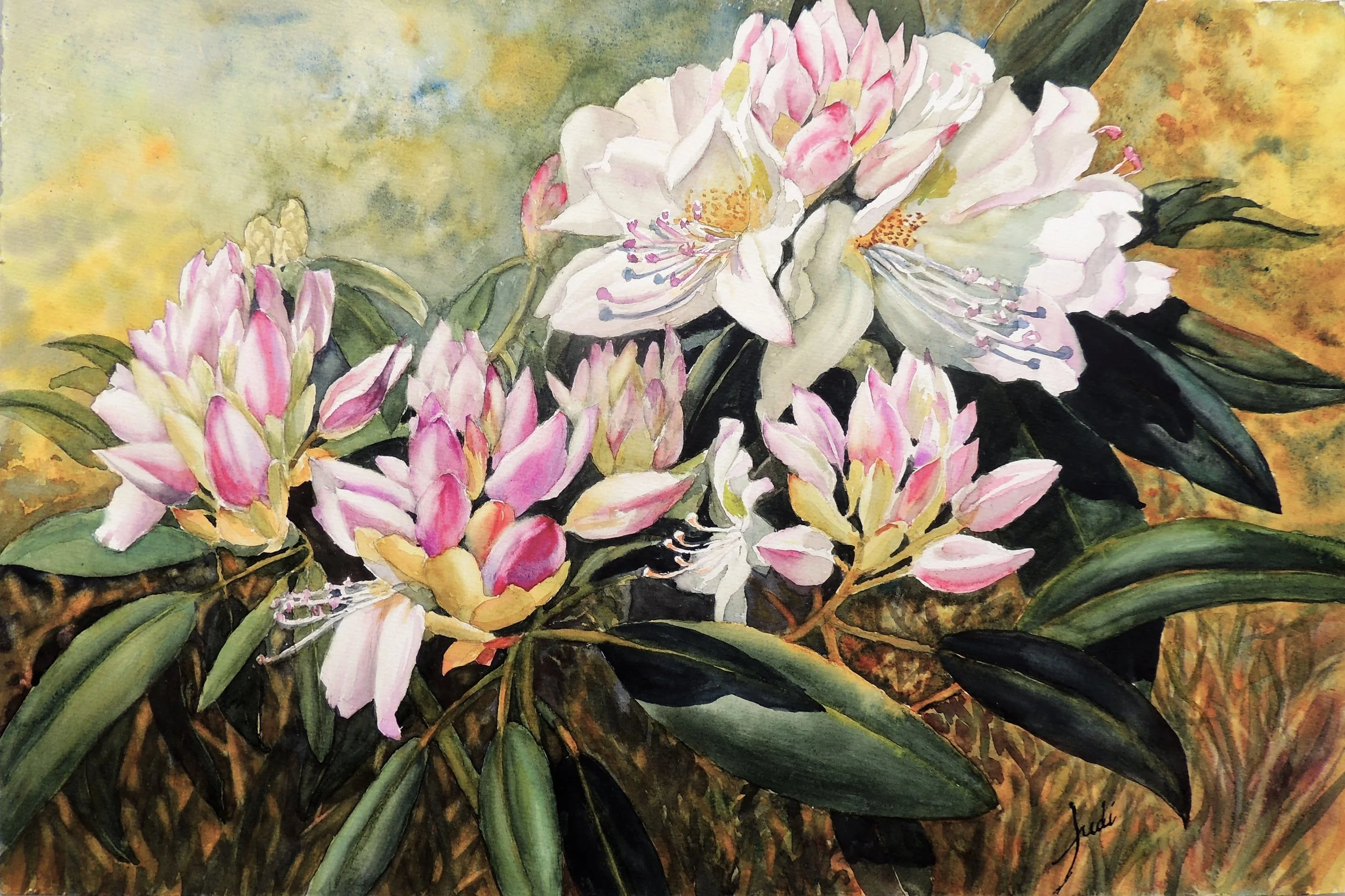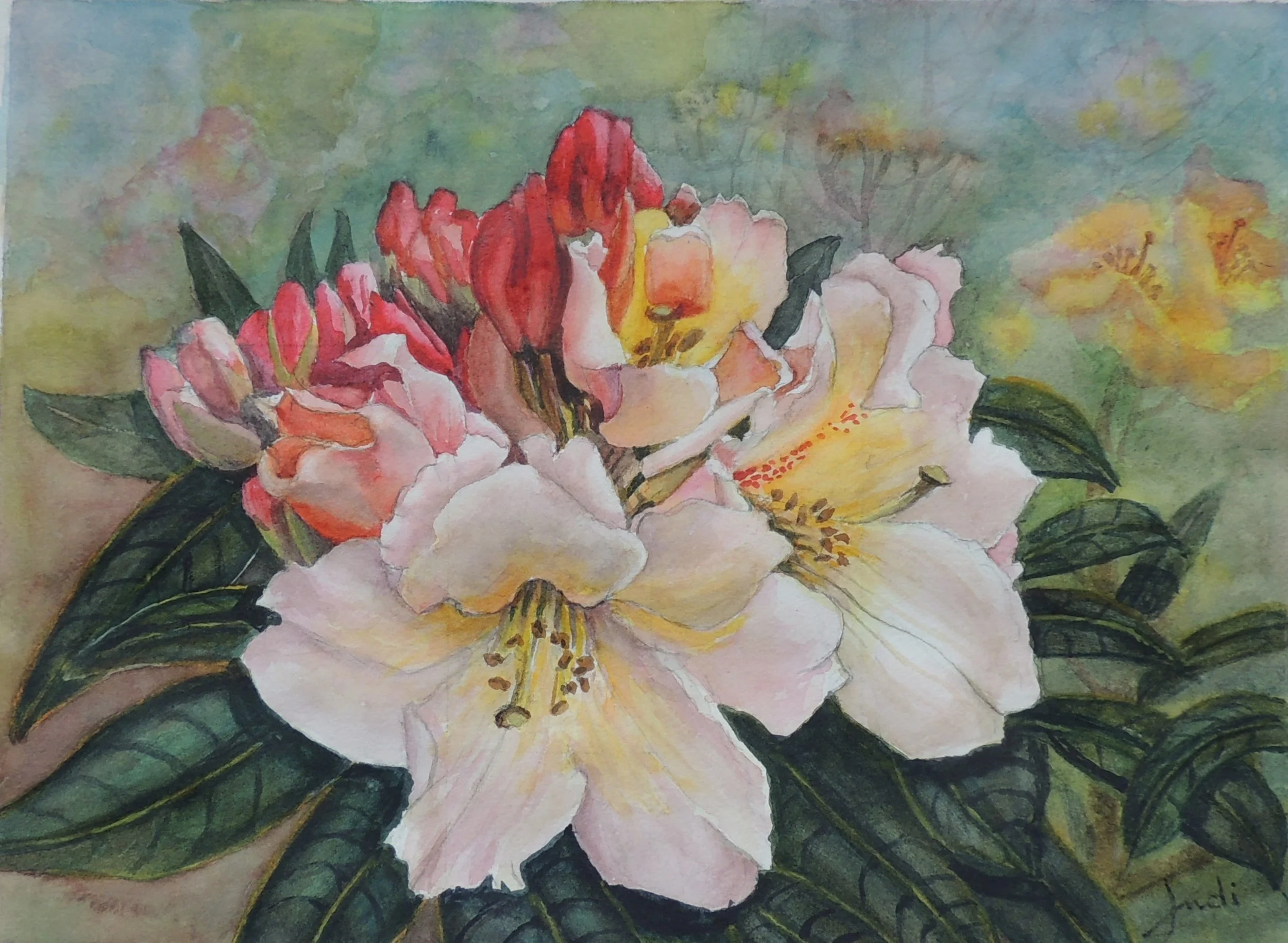 Elsie came into my life first as a student and then as a friend and later as a neighbour. We also exchanged garden treasures and she gave me a cutting of this Rhododendron. It seemed to struggle for several years and then took off! I planned to paint it but tragically Elsie passed away after a long battle with cancer. This now hangs in my bedroom and is much admired.