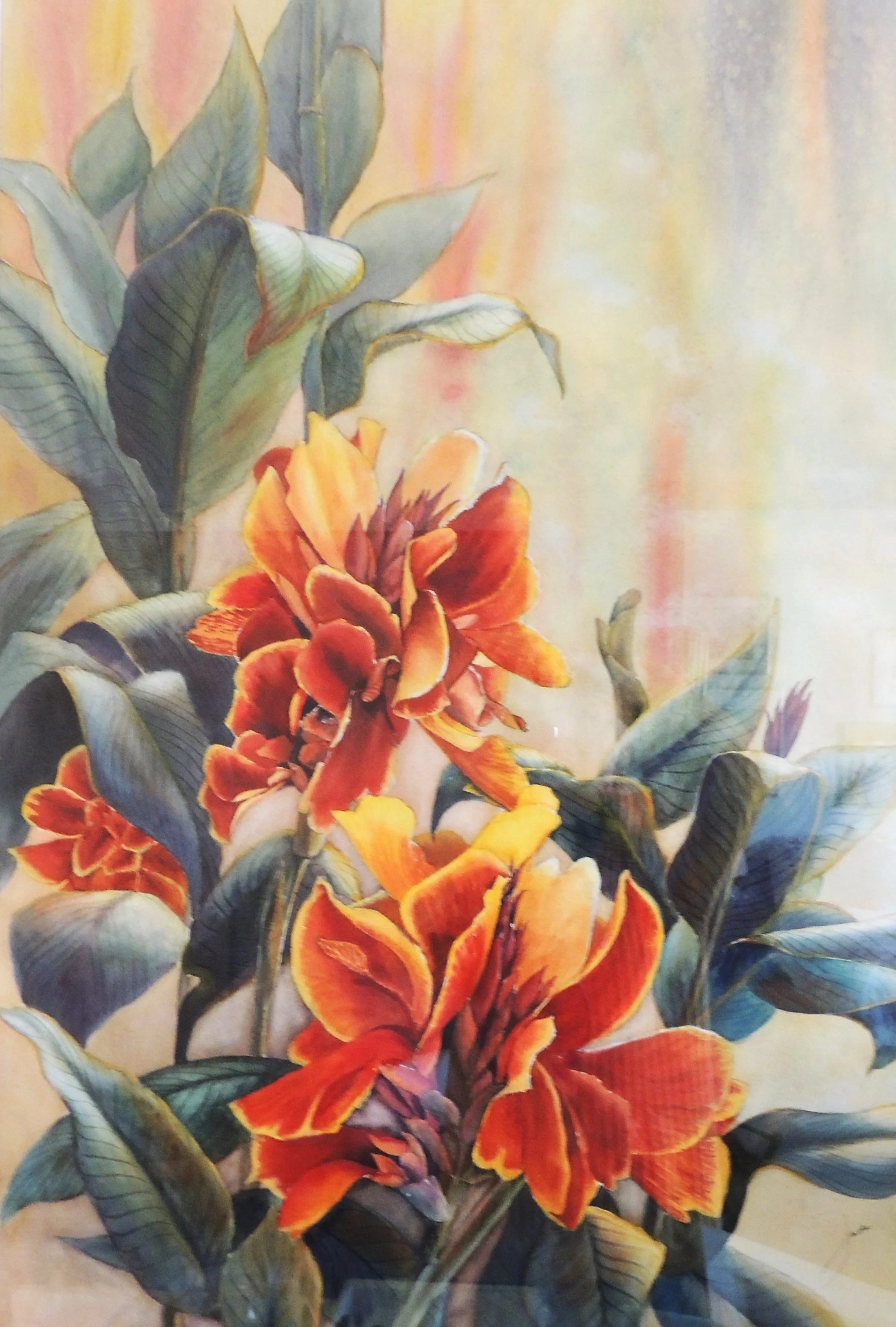 Everyone has colors they prefer to decorate their homes and to wear. My favourite colors are yellow, gold and red complimented by shades of green. These canna lillies provided all of those colours in addition to interesting shapes and twists of leaves. This was both a challenge and a joy to paint.