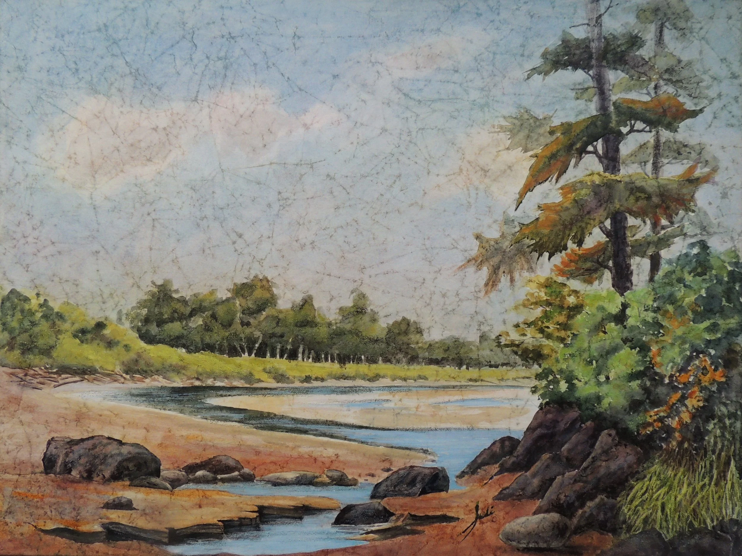 This bay is easily accessible from the Wild Pacific Trail, close to the southern end of Ucluelet, BC. My short visit to the area was rainy and misty most of the time but included a few walks on beaches. I was attracted by the reflections here and decided to make the feature of a painting on Masa paper.