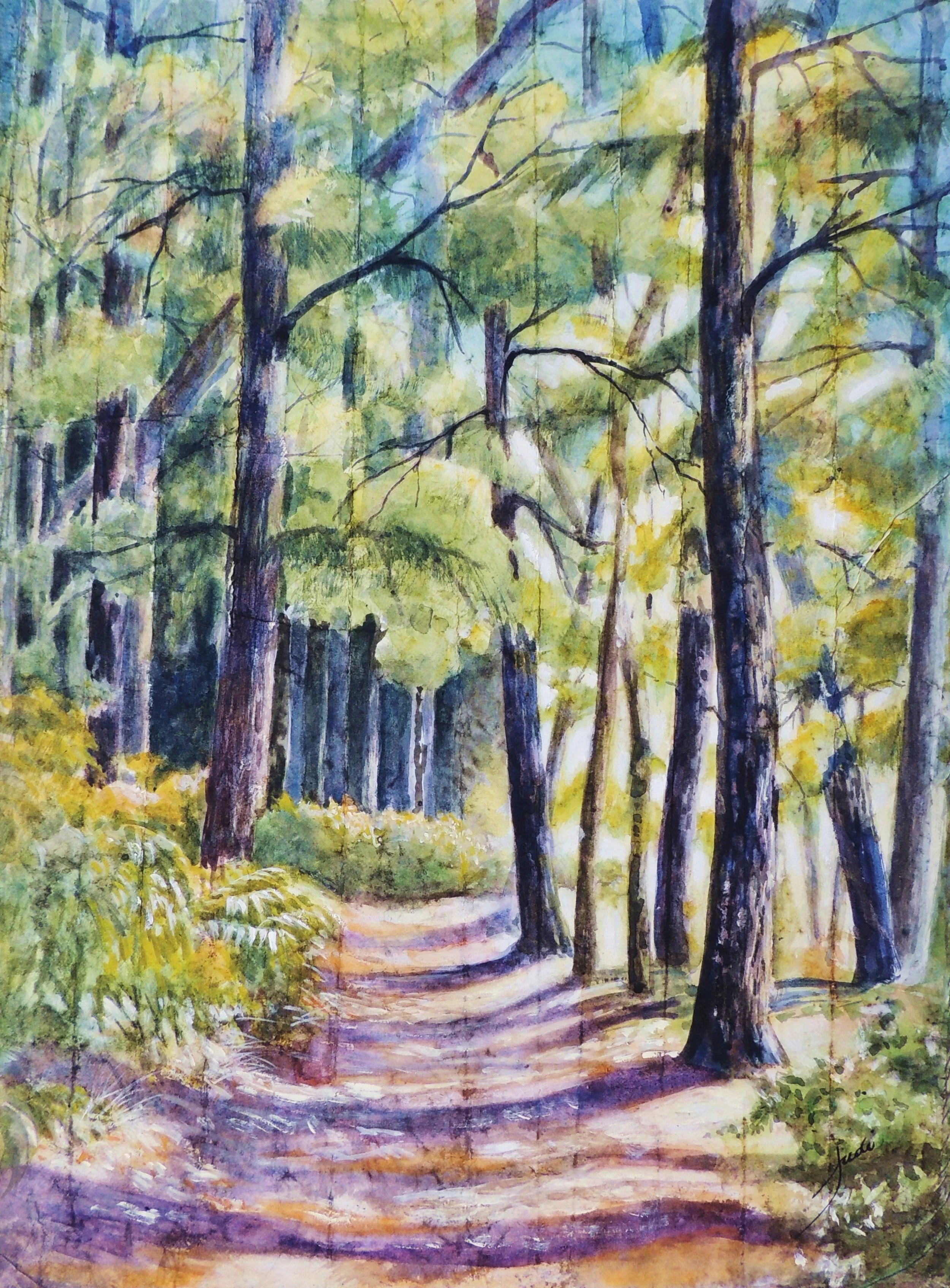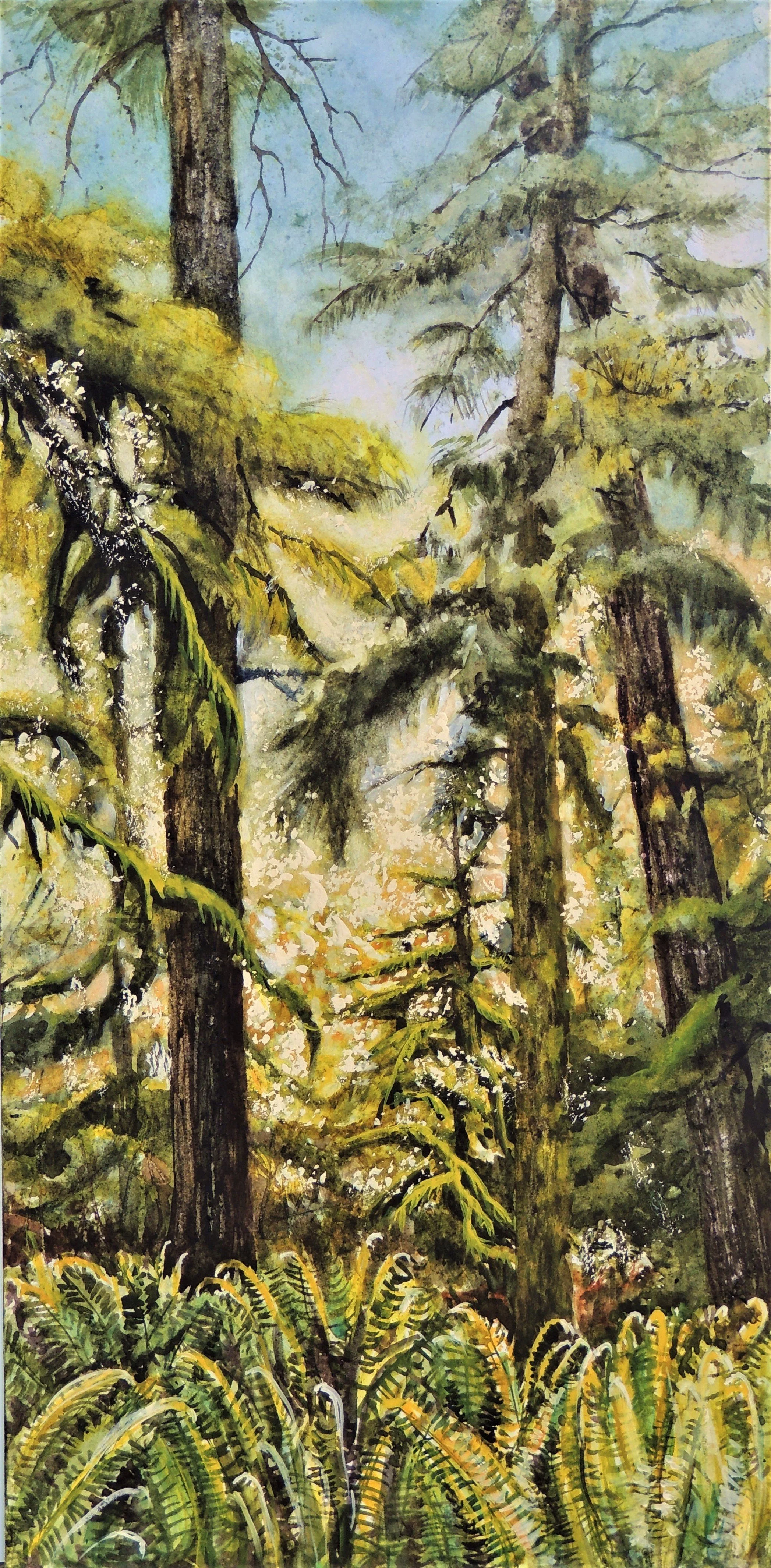 In creating this scene on traditional watercolour paper in 2011, it quickly went home with happy purchasers, so I decided to use my Gabriola Island photo, to repeat the image on masa paper, which lends itself well to foliage and natural subjects.