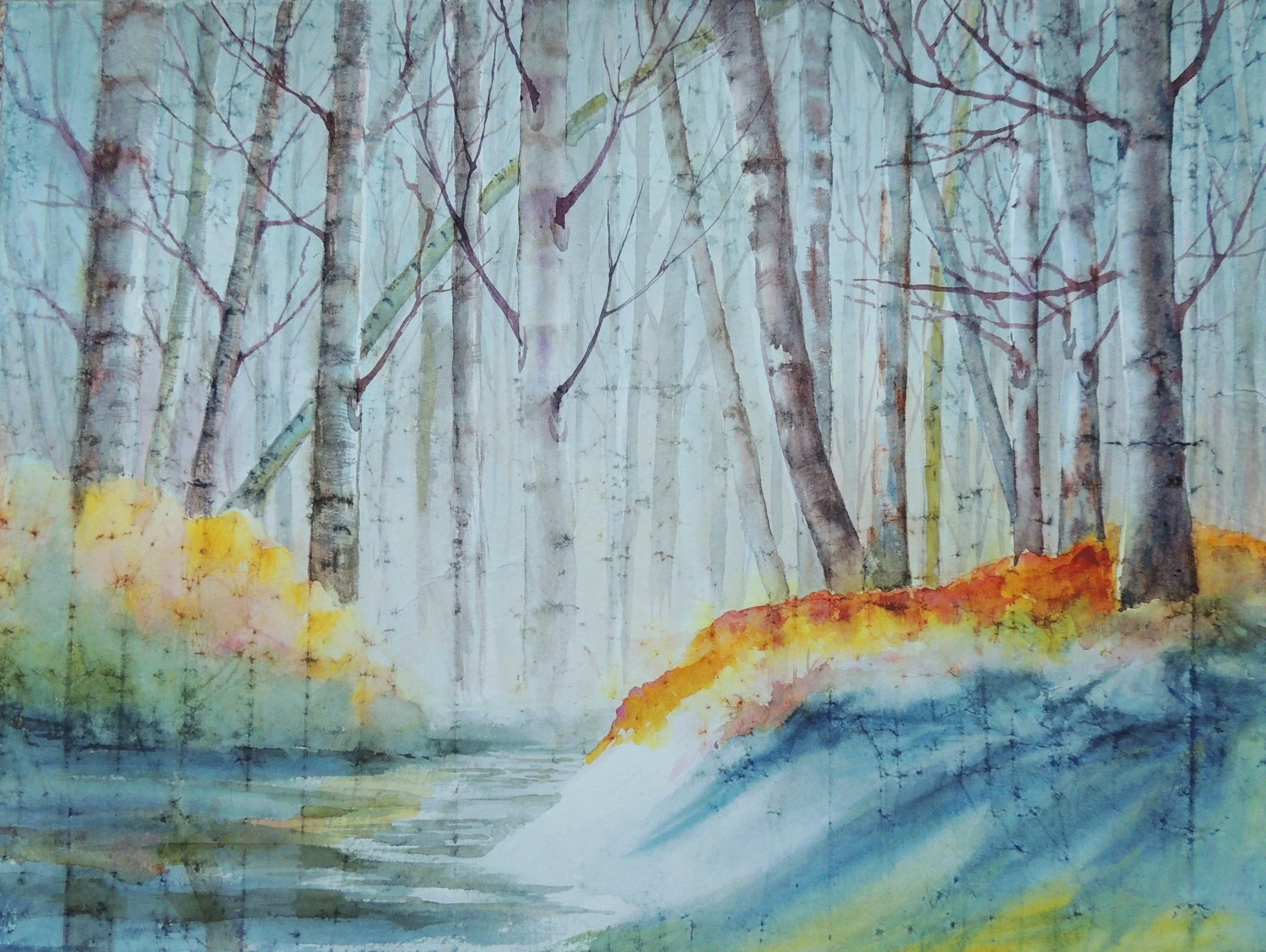 Working from the distance I created pale tree trunks, suggesting silver birches. As they dried, I added more trees, moving into mid-ground and heavier trunks cut off by colorful land. In between mist rising from icy water produced an early morning glow and the promise of later sunshine.