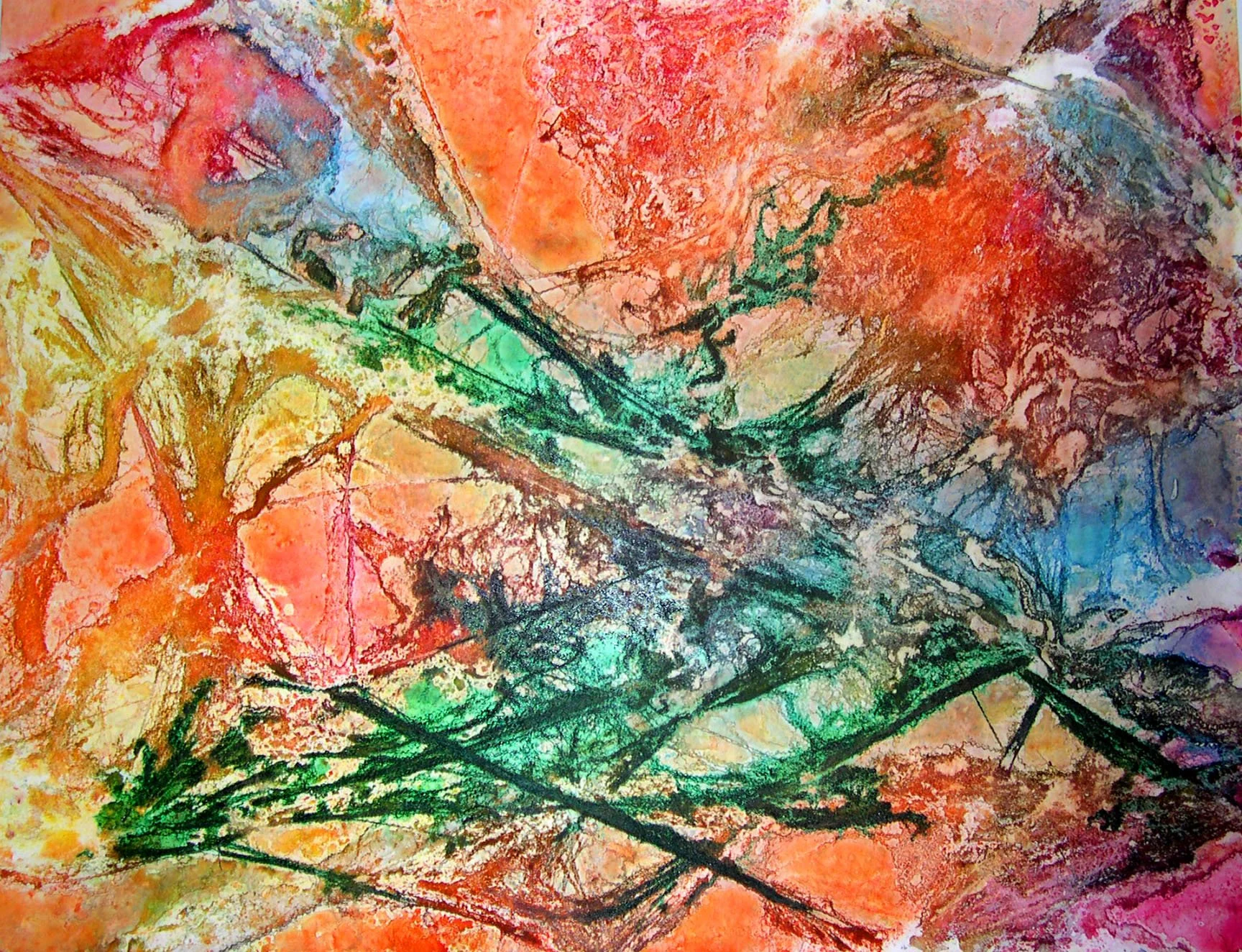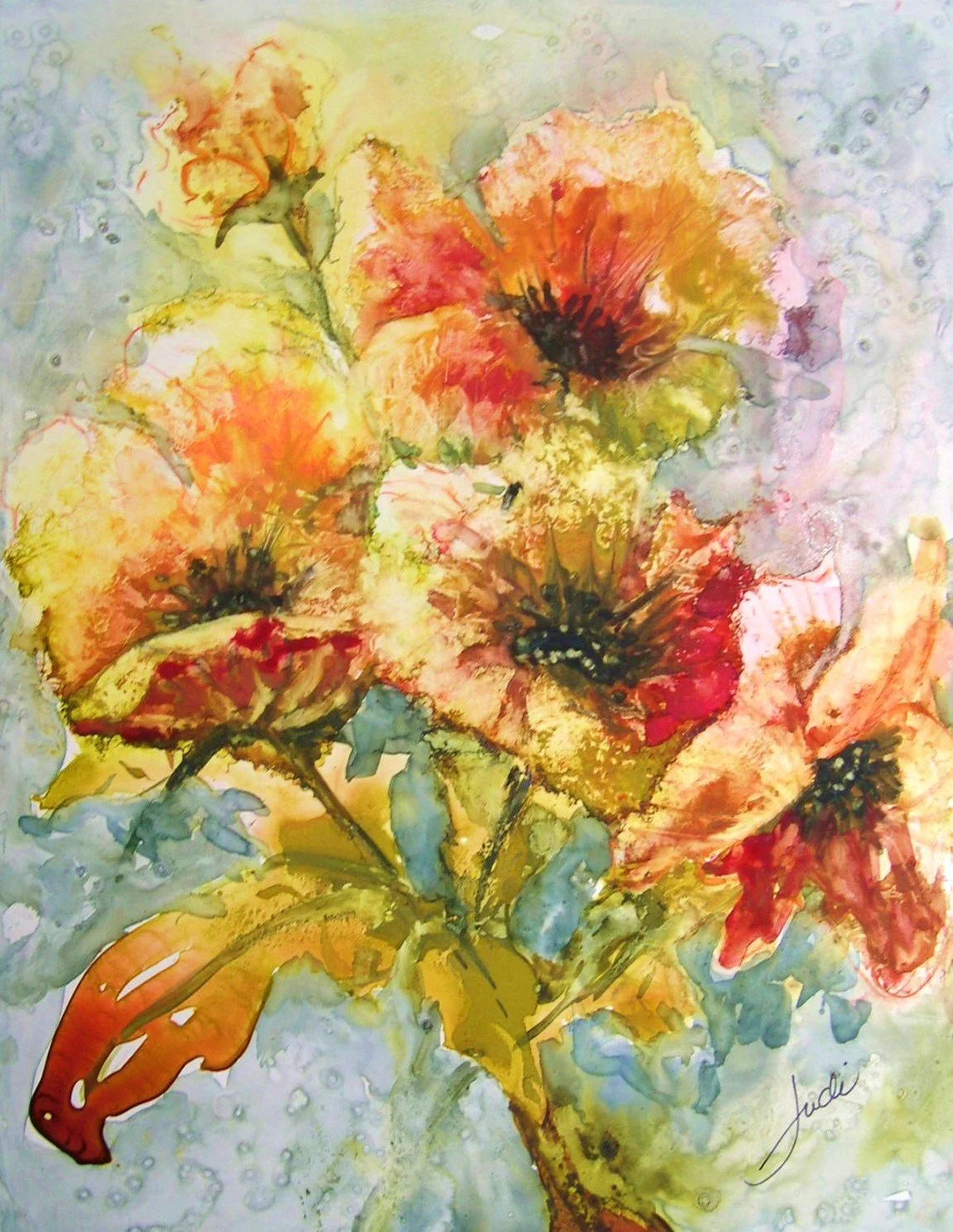 This painting was pure fun! I used yupo which is a synthetic paper made from polypropylene. I poured and sprayed paint and inks over “spider web” until I was satisfied with the distribution and amounts of color. The more you study it, the more things you find in it. The result is marvelous texture and definitely is a departure from my usual painting style.