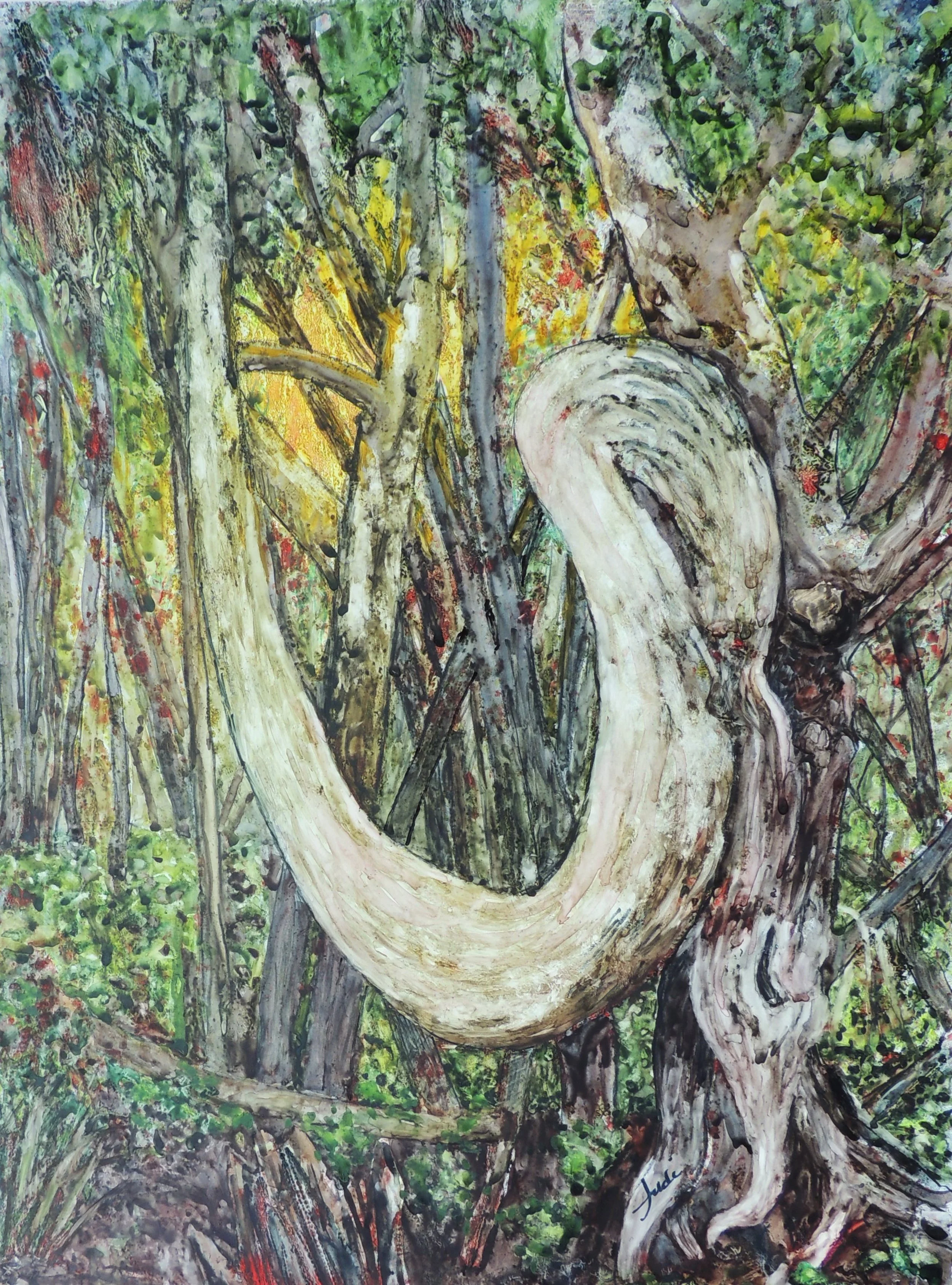 Walking along the west coast trail near Ucluelet on Vancouver Island, I was astounded to find this contorted tree. Nature is extraordinary at times. I started with painting the background on yupo, setting in surrounding growth and warm light. Because yupo is not paper but rather plastic, I was able to lift off some of the paint to create this amazing subject looking quite like the original tree trunk.